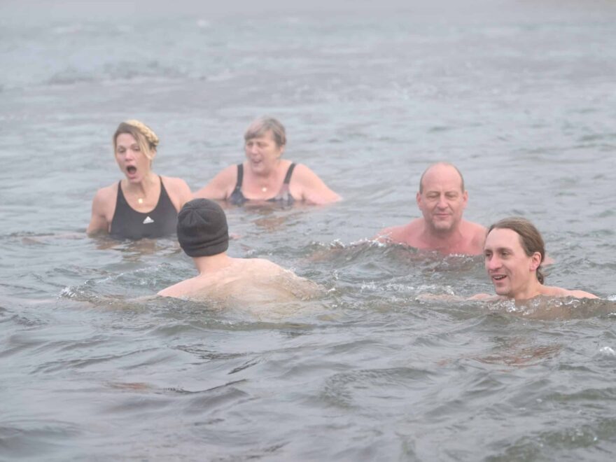 Za přísného dodržování rozestupů při sportu si několik desítek otužilců našlo v 9 ráno čas zaplavat si v ledové (